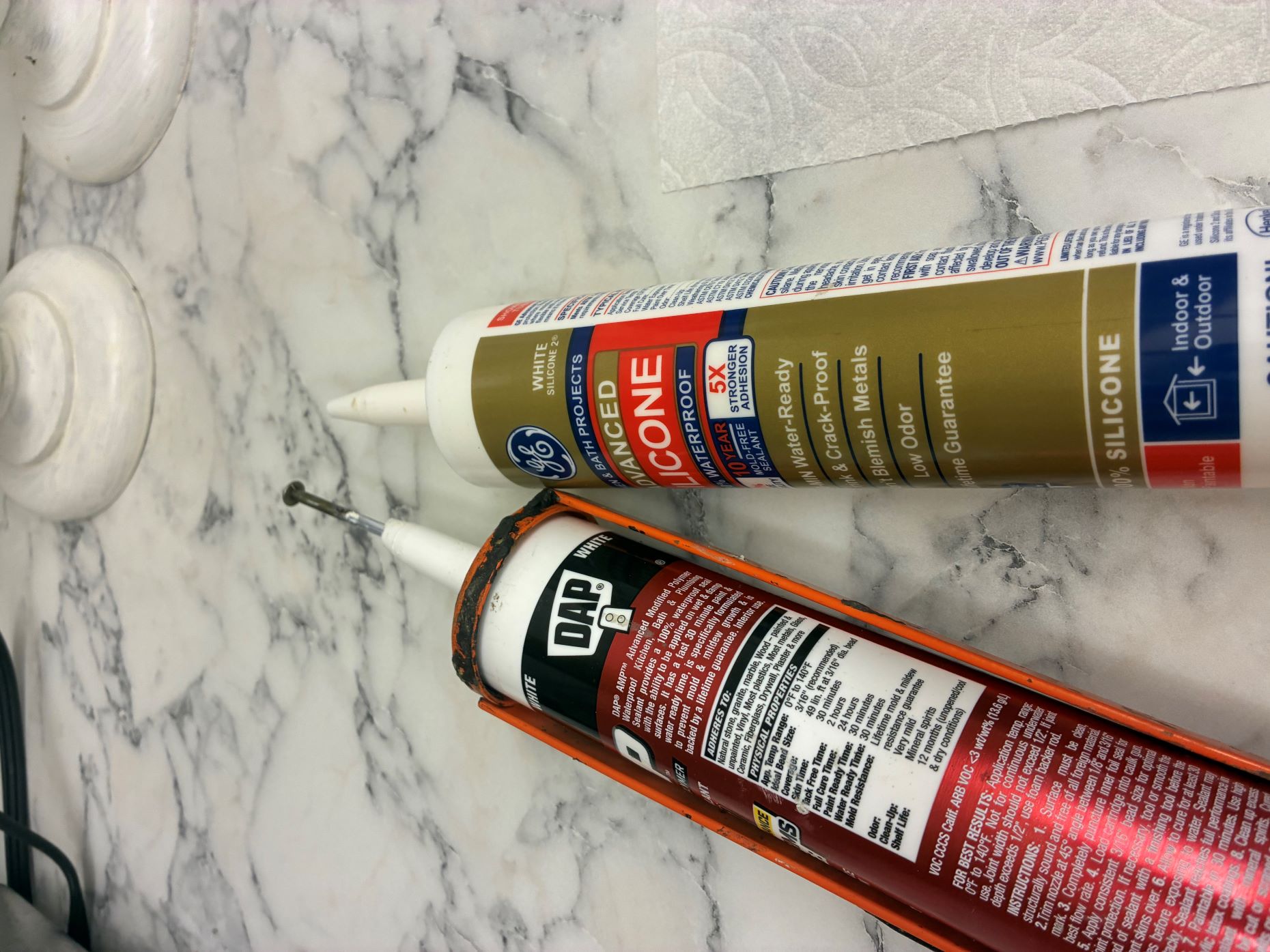 The clear was clearly dried out, but the white was not. So, I set about poking and squeezing until it was flowing. If I can get away with it, I will cut half the nozzle off but that amount of opening causes a very wide bead. That tactic is not really suitable for a for a bath job unless you are OK with it all over the place. I was not.