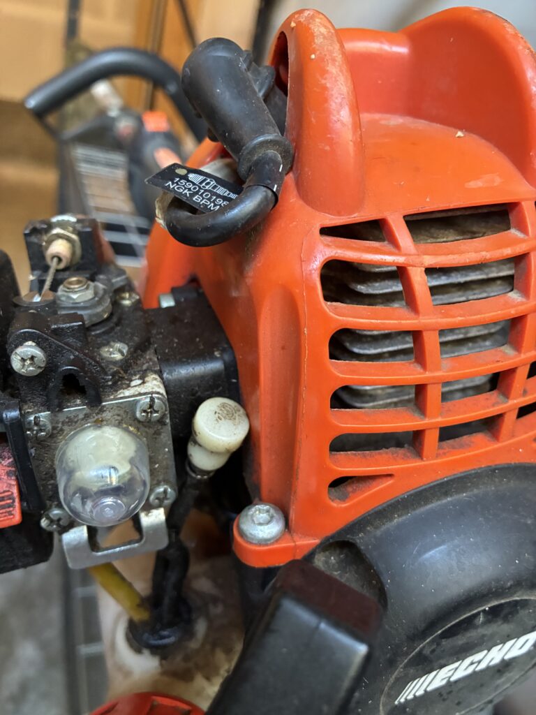 I also had to use the starter fluid to get the trimmer going. It had an additional problem that the priming bulb cracked as I was pushing on it. The second picture is the new bulb installed and I also changed the filter and spark plug. I did this because the filter was pretty clogged and those items came with the tune-up kit. Now that is up and going again.