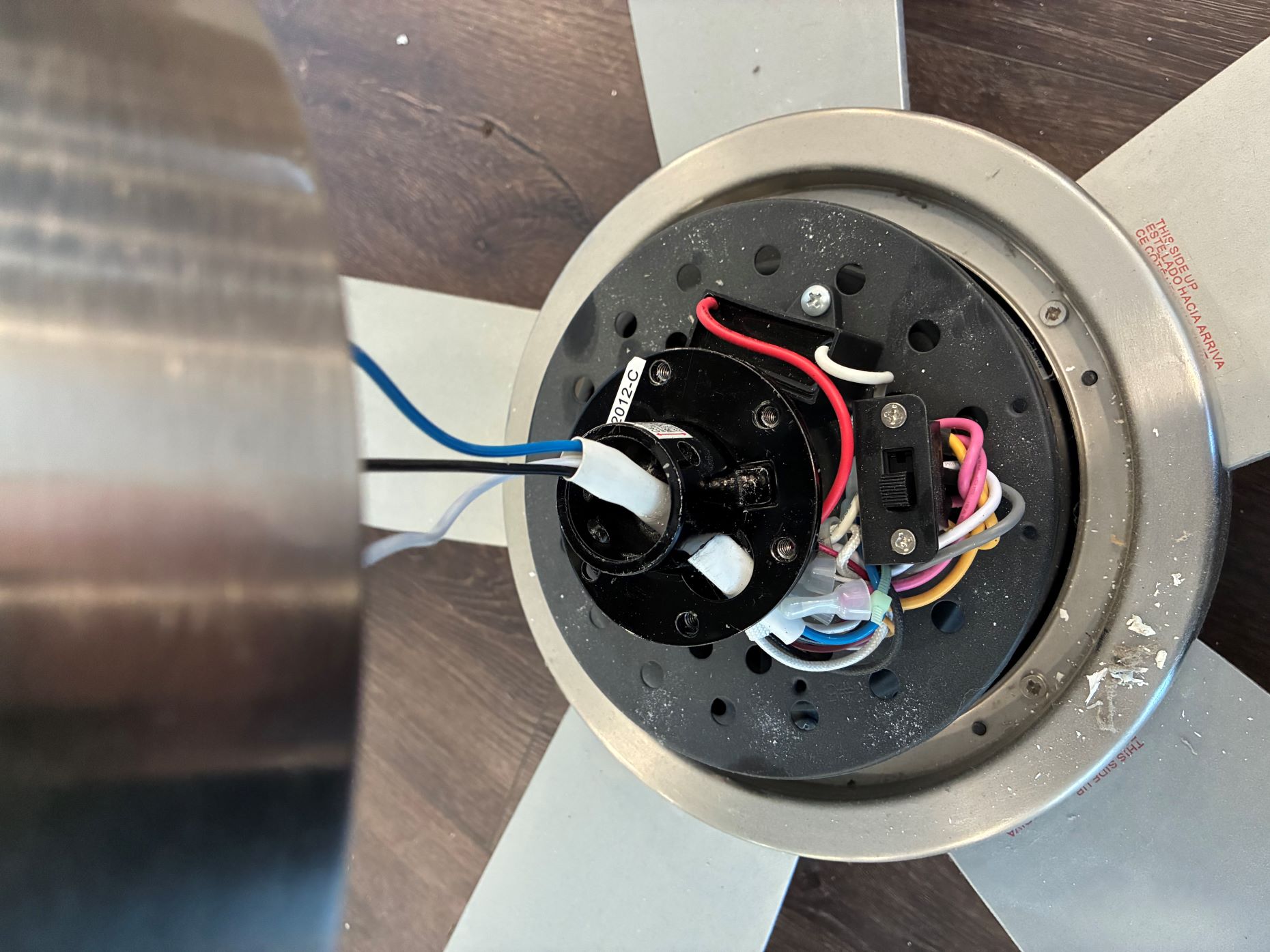 I move to the second fan and I don’t see a switch. I checked three different angles on the fan base. Then my wife wanted to see. She said, “here is the hole where it is supposed to be”. I said “what”? I still couldn’t see it. Once I got through the paradigm that the switch wasn’t there, I missed it because I was looking for something raised, not a hole She was underneath the fan and said that it looks different than the other fans. We did some bickering about why I could not see the hole and I reluctantly agreed to take the fan down and see what I could see.